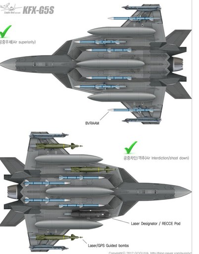韓國公布的這組KFX-G5S戰(zhàn)機(jī)圖片中的另一關(guān)鍵技術(shù)要點(diǎn)是,有別于之前任何一款第五代戰(zhàn)機(jī)方案,韓國似乎在構(gòu)想KFX-G5S型戰(zhàn)機(jī)之初,就將外部掛載視作主要性能,而非像美制第五代戰(zhàn)機(jī)那樣,將外部掛載視作特殊情況下的無奈之舉。從韓國為KFX-G5S戰(zhàn)機(jī)規(guī)劃的掛載方案來看,作為輕型戰(zhàn)機(jī)的KFX-G5S,在無內(nèi)部掛載的情況下,外掛點(diǎn)超過10個(gè),基本達(dá)到F-16戰(zhàn)機(jī)的水平。如果再考慮第五代戰(zhàn)機(jī)較之第四代戰(zhàn)機(jī)較大的內(nèi)部空間帶來的機(jī)內(nèi)載油優(yōu)勢,KFX-G5S型戰(zhàn)機(jī)的外掛能力應(yīng)在F-16之上。