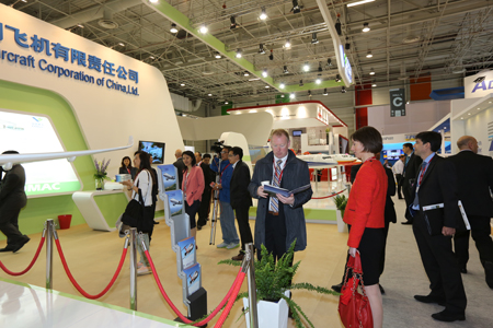 這是中國商飛公司第2次參加巴黎航展,中國商飛展臺位于巴黎航展展館5號館B片區(qū),面積約250平方米,展示了C919大型客機模型和ARJ21-700飛機模型。在此次展示的飛機模型中,全面展示了C919大型客機混合級布局,ARJ21-700飛機混合級、全經(jīng)濟級、行政機和公務(wù)機布局。