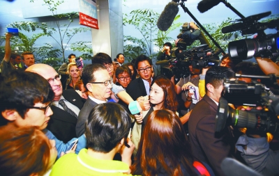 韓亞航空公司社長尹永斗(中左)抵達(dá)美國舊金山國際機(jī)場后接受媒體采訪。新華社/路透