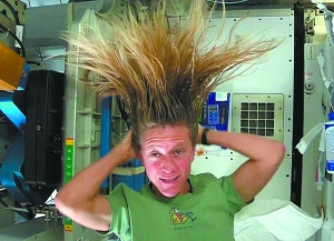 卡倫擁有一頭過(guò)肩長(zhǎng)發(fā),在太空里這些頭發(fā)全都豎了起來(lái),顯得“怒發(fā)沖冠”。在國(guó)際空間站里,水不會(huì)像地球上那樣從高往低流,而是會(huì)變成無(wú)數(shù)小水珠到處亂飄。