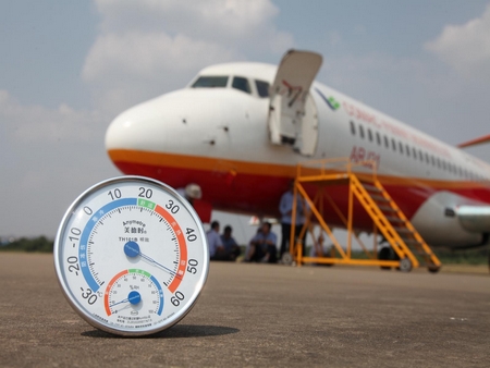 開飛前機(jī)場(chǎng)地面溫度已達(dá)到55攝氏度。