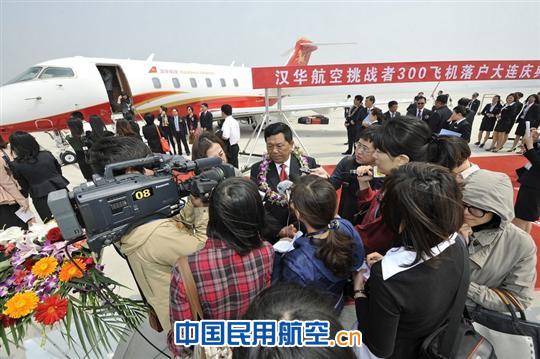 上圖為:漢華航空首架挑戰(zhàn)者300飛機落戶大連儀式現(xiàn)場
