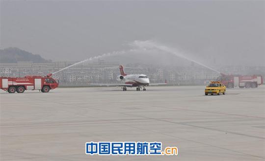 上圖為:飛機滑行中接受了大連國際機場給予的最高規(guī)格禮遇——水幕洗塵
