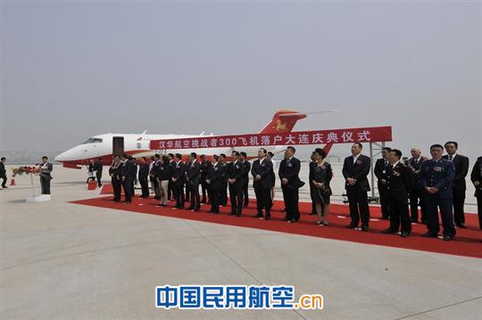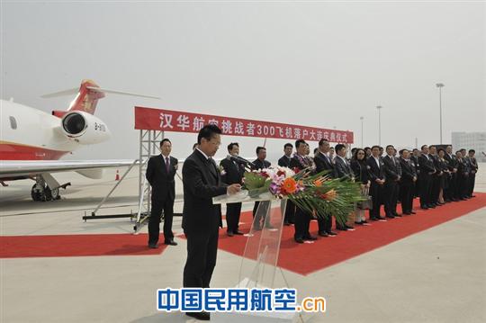 上圖為:漢華航空首架挑戰(zhàn)者300飛機落戶大連儀式現(xiàn)場