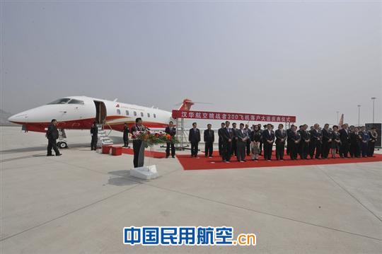 在歡迎儀式上,漢華公務機航空有限公司總裁楊建新、大連國際機場集團有限公司副總經(jīng)理杜志淵、大連港口口岸局局長高連分別致辭。楊建新總裁對各位來賓的光臨表示了熱烈的歡迎和衷心的感謝,漢華公務機航空有限公司首架挑戰(zhàn)者300型飛機的成功引進并正式落戶大連,得到了民航東北地區(qū)管理局、大連市人民政府以及大連國際機場和其他各有關方面的大力支持協(xié)助,首架飛機的入列,標志著漢華公務機航空有限公司進入了新的發(fā)展階段,飛機投入運營后,公司將始終不渝地堅持“安全第一,預防為主,綜合治理”的指導思想,堅持高起點、高標準、嚴要求,確保飛行安全,努力將漢華航空打造成中國一流公務機航空服務品牌。大連市港口口岸局局長高連在致辭中對漢華航空首架飛機的成功引進表示熱烈的祝賀,對楊建新總裁為首的接機人員表示親切慰問,衷心希望漢華航空以此為起點,不斷加強企業(yè)管理,苦練內(nèi)功,努力創(chuàng)造新的輝煌,將漢華航空打造成為大連市的一張靚麗的名片,為促進東北亞航運中心建設和帶動其他產(chǎn)業(yè)發(fā)展作出應有的貢獻。大連國際機場集團有限公司副總經(jīng)理杜志淵在致辭中指出,漢華航空引進的首架挑戰(zhàn)者300型飛機也是首架正式落戶大連的公務機,是大連國際機場的一件大事,機場方面將不斷完善公務機運行服務保障工作,為航空公司的安全運營積極創(chuàng)造有利的環(huán)境和條件。