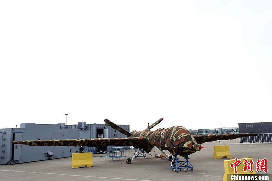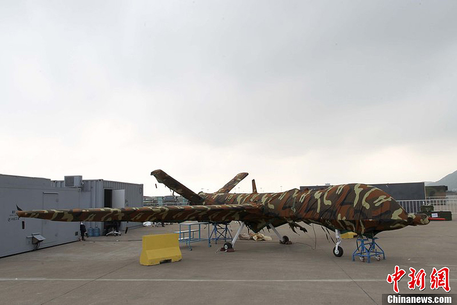 曾在前兩屆珠海航展上展出模型的翼龍無人機(jī),在今年航展上以實(shí)物參展。11月8日,該機(jī)已經(jīng)組裝完畢停放在展坪上。該款無人機(jī)由中航工業(yè)旗下成都飛機(jī)設(shè)計(jì)研究所研制,該機(jī)裝有一臺100馬力活塞發(fā)動機(jī),具備全自主平輪式起降和飛行能力,最大起飛重量達(dá)1100公斤,最大續(xù)航時間為20個小時,可攜帶各種偵察、激光照射/測距、電子對抗設(shè)備及小型空地打擊武器,可執(zhí)行監(jiān)視、偵查及對地攻擊任務(wù)等任務(wù),也可用于維穩(wěn)、反恐、邊界巡邏等。