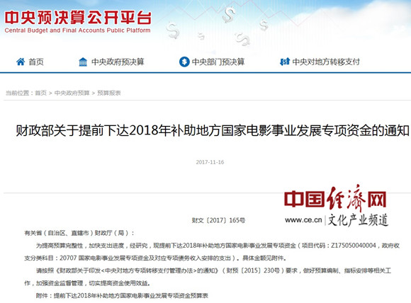 財政部關(guān)于提前下達2018年補助地方國家電影事業(yè)發(fā)展專項資金的通知