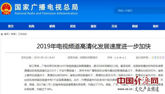 經(jīng)濟(jì)日報-中國經(jīng)濟(jì)網(wǎng)北京9月25日訊 國家廣播電視總局傳媒機(jī)構(gòu)管理司發(fā)布信息:前三季度,廣電總局已批準(zhǔn)114個電視頻道實施高清播出,是2018年同期的2.2倍。截至目前,全國各級播出機(jī)構(gòu)經(jīng)批準(zhǔn)高清播出的電視頻道已達(dá)331個(不含付費(fèi)頻道),其中中央廣播電視總臺境內(nèi)播出的高清頻道22個,高清化比例為92%;省級上星綜合頻道26個,高清化比例為84%;省級臺其他頻道82個,高清化比例為32%;地級臺186個,高清化比例為21%;縣級臺經(jīng)批準(zhǔn)保留的頻道中有7個實現(xiàn)高清播出。此外,付費(fèi)頻道中已批準(zhǔn)38個轉(zhuǎn)為高清方式播出。新疆、上海、重慶、海南、天津、湖南、四川7?。ㄊ校┑氖〖夒娨曨l道高清化率較高,均超過了75%。湖南、廣東、內(nèi)蒙古、江蘇、四川地級電視頻道高清化率較高,均超過了38%。