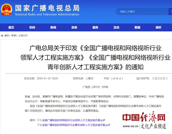 方案圍繞“推選范圍”“資格條件”“推選程序”等方面進行人選推薦選拔的具體條件的介紹。要求,年齡不超過 55 周歲;重點從廣播電視和網(wǎng)絡視聽工作一線的專業(yè)技術人員中推薦人選;注重選拔培養(yǎng)適應新時代廣播電視和網(wǎng)絡視聽發(fā)展需要的“高精尖缺”人才;將加大對廣電 5G 方向等新科技人才、網(wǎng)絡視聽新傳播人才、網(wǎng)絡文藝新創(chuàng)作人才、安全播出新保障人才、網(wǎng)絡安全新技術人才、媒體融合新運營人才的選拔培養(yǎng)力度等重要信息。>>>更多政策可查看中國經(jīng)濟網(wǎng)“中國文化產(chǎn)業(yè)政策庫”