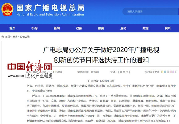 廣電總局辦公廳關于做好2020年廣播電視創(chuàng)新創(chuàng)優(yōu)節(jié)目評選扶持工作的通知