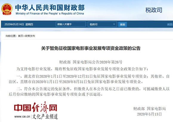 經(jīng)濟(jì)日?qǐng)?bào)-中國(guó)經(jīng)濟(jì)網(wǎng)北京5月14日訊 2020年5月13日,財(cái)政部、國(guó)家電影局發(fā)布《關(guān)于暫免征收國(guó)家電影事業(yè)發(fā)展專(zhuān)項(xiàng)資金政策的公告》。據(jù)經(jīng)濟(jì)日?qǐng)?bào)-中國(guó)經(jīng)濟(jì)網(wǎng)文化產(chǎn)業(yè)頻道(微信號(hào):cewenhua)了解,財(cái)政部、國(guó)家電影局為支持電影行業(yè)發(fā)展,湖北省自2020年1月1日至2020年12月31日免征國(guó)家電影事業(yè)發(fā)展專(zhuān)項(xiàng)資金;其他省、自治區(qū)、直轄市自2020年1月1日至2020年8月31日免征國(guó)家電影事業(yè)發(fā)展專(zhuān)項(xiàng)資金。符合規(guī)定的免征條件,但繳費(fèi)人在公告發(fā)布之日前已繳費(fèi)的,可抵減繳費(fèi)人以后月份應(yīng)繳納的國(guó)家電影事業(yè)發(fā)展專(zhuān)項(xiàng)資金或予以退還。>>>更多政策可查看中國(guó)經(jīng)濟(jì)網(wǎng)“中國(guó)文化產(chǎn)業(yè)政策庫(kù)”