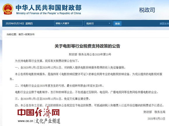 經(jīng)濟(jì)日?qǐng)?bào)-中國(guó)經(jīng)濟(jì)網(wǎng)北京5月14日訊 2020年5月13日,財(cái)政部、稅務(wù)總局發(fā)布《關(guān)于電影等行業(yè)稅費(fèi)支持政策的公告》。據(jù)經(jīng)濟(jì)日?qǐng)?bào)-中國(guó)經(jīng)濟(jì)網(wǎng)文化產(chǎn)業(yè)頻道(微信號(hào):cewenhua)了解,自2020年1月1日至2020年12月31日,對(duì)納稅人提供電影放映服務(wù)取得的收入免征增值稅。對(duì)電影行業(yè)企業(yè)2020年度發(fā)生的虧損,最長(zhǎng)結(jié)轉(zhuǎn)年限由5年延長(zhǎng)至8年。自2020年1月1日至2020年12月31日,免征文化事業(yè)建設(shè)費(fèi)。