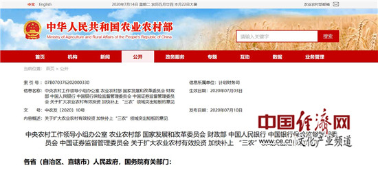 經(jīng)濟日報-中國經(jīng)濟網(wǎng)北京7月14日訊 近日,中央農(nóng)辦、農(nóng)業(yè)農(nóng)村部、發(fā)展改革委、財政部、人民銀行、銀保監(jiān)會、證監(jiān)會等7部門聯(lián)合印發(fā)《關(guān)于擴大農(nóng)業(yè)農(nóng)村有效投資 加快補上“三農(nóng)”領(lǐng)域突出短板的意見》(以下簡稱《意見》),部署擴大農(nóng)業(yè)農(nóng)村有效投資,為打贏脫貧攻堅戰(zhàn)和全面建成小康社會提供堅實支撐。
