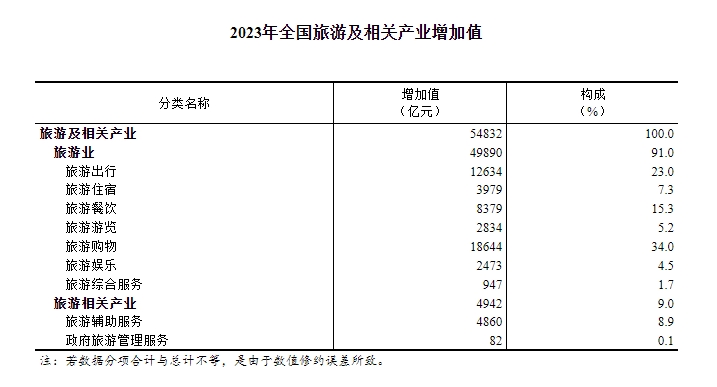 從內(nèi)部構(gòu)成看,旅游業(yè)增加值為49890億元,占旅游及相關(guān)產(chǎn)業(yè)增加值比重為91.0%,比上年提高1.7個百分點。旅游相關(guān)產(chǎn)業(yè)增加值為4942億元,占旅游及相關(guān)產(chǎn)業(yè)增加值比重為9.0%,比上年下降1.7個百分點?!?/p>