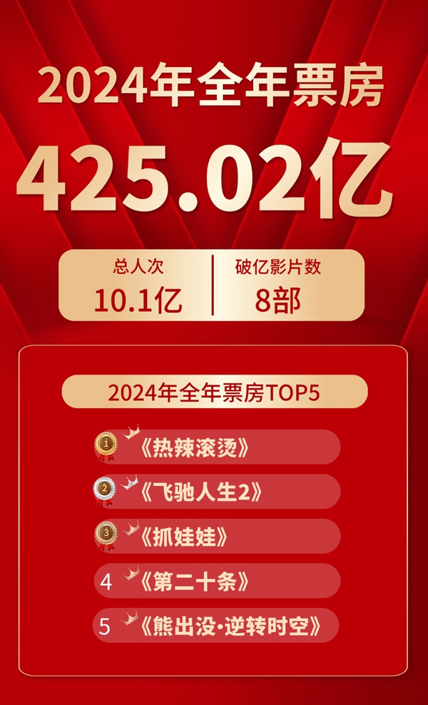 據(jù)貓眼專業(yè)版數(shù)據(jù),2024年全年共有8部影片破10億,年度票房冠軍為春節(jié)檔影片《熱辣滾燙》,全年大盤占比為8.1%。年度TOP10影片分別為《熱辣滾燙》《飛馳人生2》《抓娃娃》《第二十條》《熊出沒·逆轉(zhuǎn)時(shí)空》《默殺》《志愿軍:存亡之戰(zhàn)》《年會(huì)不能停!》《哥斯拉大戰(zhàn)金剛2:帝國(guó)崛起》《你想活出怎樣的人生》,其中,國(guó)產(chǎn)片占據(jù)八席,進(jìn)口片占據(jù)兩席,涵蓋類型包括喜劇、劇情、犯罪、戰(zhàn)爭(zhēng)、動(dòng)作、動(dòng)畫等。整體看來,2024年電影市場(chǎng)仍呈現(xiàn)出較強(qiáng)的韌性和上升空間。