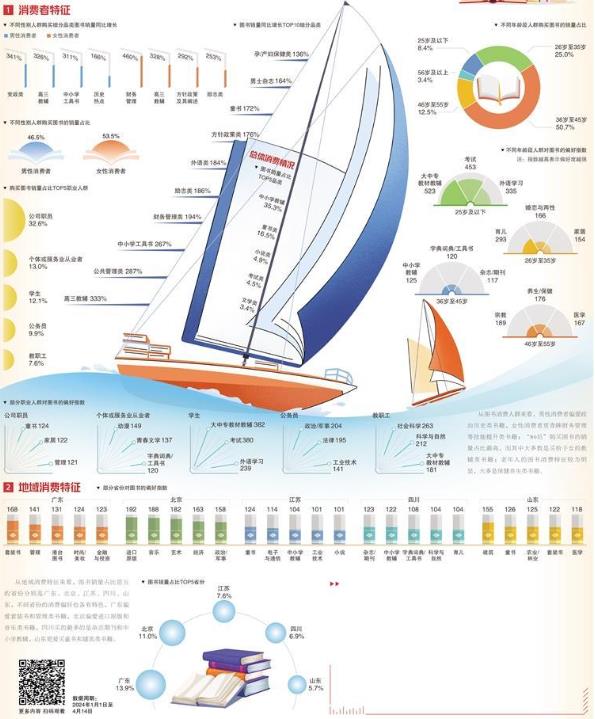 圖書是人們求知的階梯,也是不少人遇到現(xiàn)實問題時,尋找解決途徑的重要選擇。無論是學生、職場人、管理者,還是年輕父母、中老年人,不同的閱讀偏好也體現(xiàn)出生活重心和關(guān)注點的區(qū)別。從圖書消費人群來看,“80后”人群購買圖書的銷量占比最高,超過了50%。從圖書銷量及增長的占比情況來看,教輔類圖書最受歡迎,增長勢頭十分強勁。