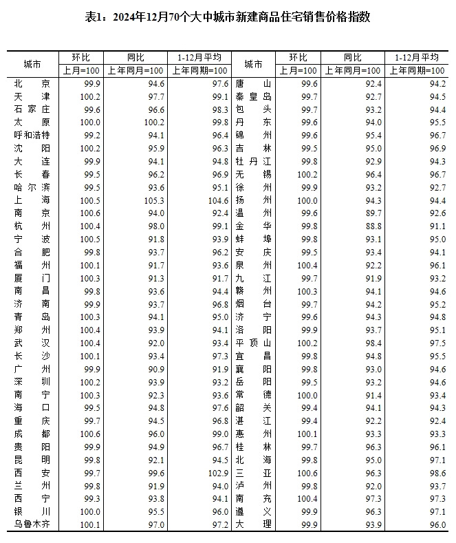 中國經濟網北京1月17日(記者 李方) 17日,國家統(tǒng)計局發(fā)布2024年12月份70個大中城市商品住宅銷售價格變動情況統(tǒng)計數(shù)據(jù)。數(shù)據(jù)顯示,2024年12月份,70個大中城市中,一線城市商品住宅銷售價格環(huán)比上漲,二三線城市環(huán)比總體降幅收窄;一二三線城市同比降幅均繼續(xù)收窄。