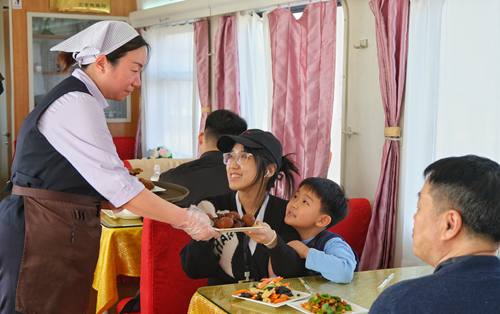 春運(yùn)首日鐵路天津客運(yùn)段值乘的T253次列車(chē)上餐車(chē)服務(wù)人員正在為旅客提供用餐服務(wù)。(楊寶森/攝)