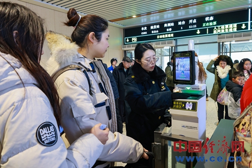 白山東站服務(wù)人員在進(jìn)站通道為旅客驗(yàn)票乘車。(國鐵集團(tuán)沈陽局集團(tuán)公司供圖)