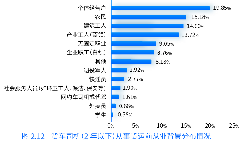 不僅如此,報告中還提到,過往貨運行業(yè)對傳統(tǒng)行業(yè)從業(yè)者的吸引力較強,多為農(nóng)民、個體經(jīng)營戶、產(chǎn)業(yè)工人(藍領(lǐng))、無固定職業(yè)、建筑工人等群體。而近幾年,轉(zhuǎn)型從事貨車司機的職業(yè)還包含了企業(yè)職工(白領(lǐng))、社會服務(wù)人員、學(xué)生等,另外,外賣員、快遞員、網(wǎng)約車司機及代駕司機等新型靈活就業(yè)者也有部分人群選擇轉(zhuǎn)行成為貨車司機。