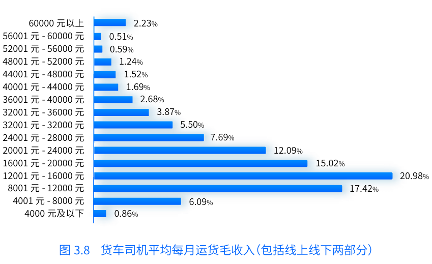 報告中提到,貨車司機每月毛收入平均值為20441元。在剔除油(電、氣)費、高速費、保險、保養(yǎng)和平臺信息技術(shù)服務(wù)費等成本后,貨車司機平均月凈收入均值為12063元。