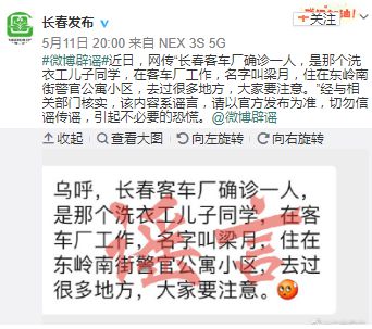此外,5月11日晚,長春市委網(wǎng)絡(luò)安全和信息化委員會辦公室官方微博發(fā)消息稱,經(jīng)與相關(guān)部門核實,“長春客車廠確診一人”等信息也系謠言。