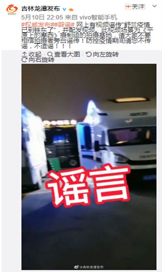 據(jù)吉林省吉林市龍?zhí)秴^(qū)信息與網(wǎng)絡(luò)服務(wù)中心官方微博5月10日消息,網(wǎng)上有視頻謠傳“舒蘭疫情已到鐵東”。經(jīng)核實,此視頻場景為《平原上的摩西》攝制組的拍攝基地,請大家不要相信拍攝者旁白謠傳。