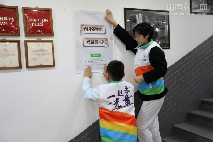 活動中,“制止餐飲浪費(fèi)”青少年志愿者們首先將宣傳節(jié)約糧食、反對浪費(fèi)的標(biāo)語海報(bào)張貼在餐廳顯著位置。