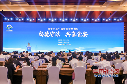 由經(jīng)濟(jì)日報(bào)社主辦、中國經(jīng)濟(jì)網(wǎng)承辦,主題為“尚德守法 共享食安”的第十六屆中國食品安全論壇9月11日在北京舉行。圖為論壇現(xiàn)場。