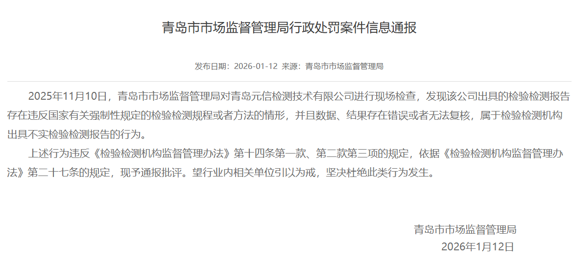 這場圍繞雞蛋角黃素的爭議,最早在今年“3?15”前后引發(fā)廣泛關(guān)注。某打假人連續(xù)發(fā)布檢測報告,稱在商超渠道購買的多款雞蛋中檢出角黃素,并點(diǎn)名黃天鵝等品牌,正式拉開事件序幕。隨著官方抽檢結(jié)果公布,個人送檢“檢出角黃素”與官方抽檢“未檢出角黃素”兩種結(jié)論并存,相關(guān)討論也從食品安全本身,進(jìn)一步延伸至檢測報告的公信力之爭。其中,為某打假人提供檢測報告的檢測機(jī)構(gòu)合規(guī)性備受質(zhì)疑:據(jù)青島市市場監(jiān)管局公開信息,青島元信檢測技術(shù)有限公司因“出具不實檢驗檢測報告”“數(shù)據(jù)無法復(fù)核”等問題,已于2026年1月12日被行政處罰。