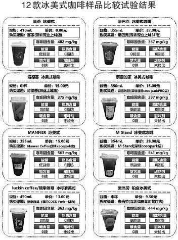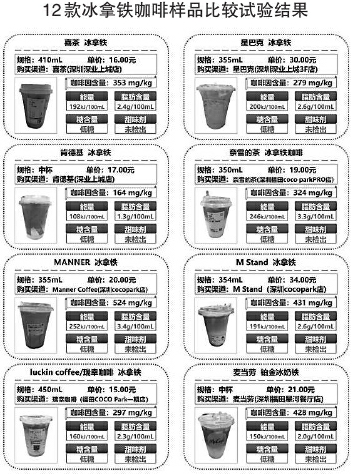 據(jù)介紹,24款現(xiàn)制冰咖啡樣品均不另外加糖,其中美式咖啡和拿鐵咖啡各12款樣品,標稱品牌涉及喜茶、星巴克、肯德基、奈雪的茶、Manner Coffee、M Stand、瑞幸咖啡、麥當(dāng)勞、皮爺咖啡、庫迪咖啡、Tims天好咖啡、COSTA等12個,價格從8元至36元不等。