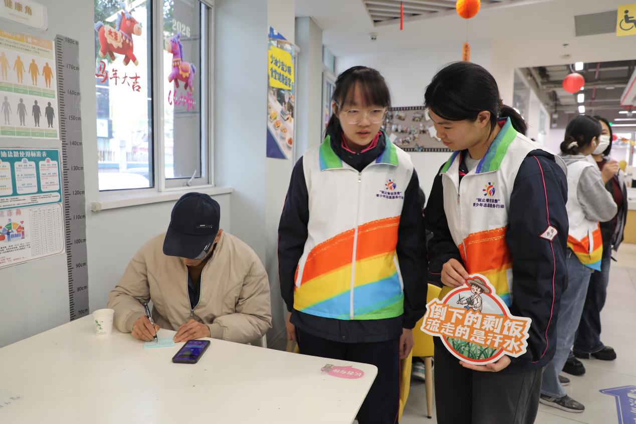 在實踐環(huán)節(jié),志愿者們將節(jié)約糧食的標(biāo)語海報張貼在餐廳顯著位置,并化身“制止餐飲浪費(fèi)”宣傳員,向餐廳中的食客講解節(jié)約糧食的重要性,邀請食客寫下減少浪費(fèi)的心得體會,將“一起來光盤”的節(jié)約理念傳遞給餐廳的消費(fèi)者。