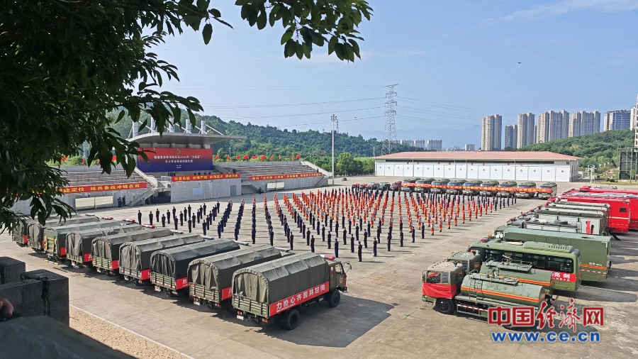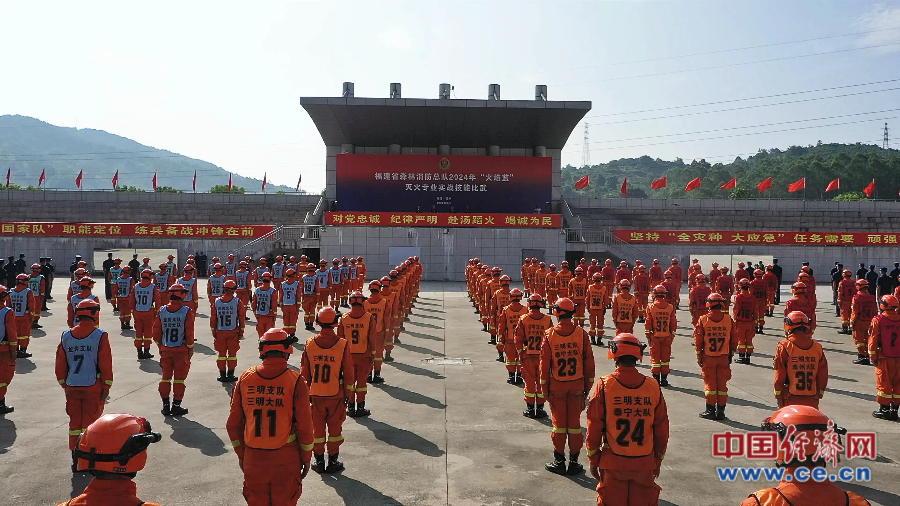福建省森林消防總隊(duì)2024年“火焰藍(lán)”滅火專業(yè)實(shí)戰(zhàn)技能比武開幕式現(xiàn)場(chǎng)。 蔡增欣/攝