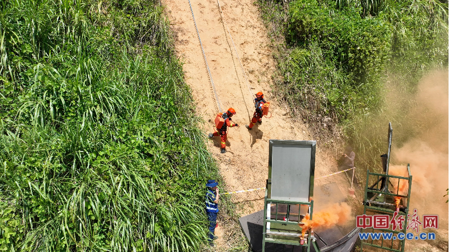 消防員在特殊地形處置煙點(diǎn)。特殊地形煙點(diǎn)處置是指在無(wú)法直接接近的陡坡設(shè)置模擬煙點(diǎn)(水袋),要求人員協(xié)同利用繩索技術(shù)安全抵近煙點(diǎn)進(jìn)行處置,以輸水時(shí)間和組織的安全性綜合評(píng)定成績(jī),檢驗(yàn)特殊地形條件下滅火、救援技術(shù)結(jié)合運(yùn)用的能力。 李為展/攝