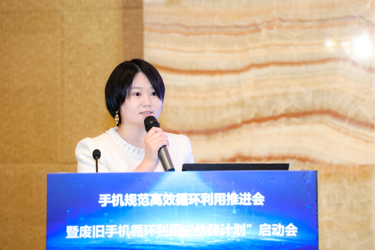 中國循環(huán)經(jīng)濟(jì)協(xié)會(huì)互聯(lián)網(wǎng)+資源循環(huán)利用專委會(huì)秘書長侯允在會(huì)上發(fā)布廢舊手機(jī)循環(huán)利用團(tuán)體標(biāo)準(zhǔn)框架。(主辦方供圖)
