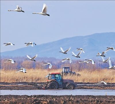 眼下,各地春耕一派繁忙。在黑龍江省同江市的一處水田里,正在作業(yè)的農(nóng)機(jī)和起飛的天鵝同框,構(gòu)成一幅靈動(dòng)的春日畫(huà)卷。劉萬(wàn)平攝(新華社發(fā))