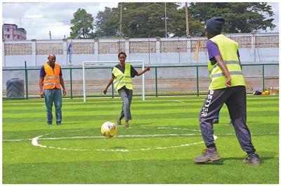 肯尼亞內(nèi)羅畢河流域生態(tài)修復項目建起足球場,為當?shù)鼐用裉峁┬蓍e健身設(shè)施。本報記者 黃煒鑫攝