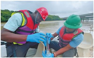 當?shù)貑T工在圭亞那新德梅拉拉河大橋旁進行水質(zhì)抽樣檢測?!”緢罄乐行姆稚?維娜·甘加丁攝