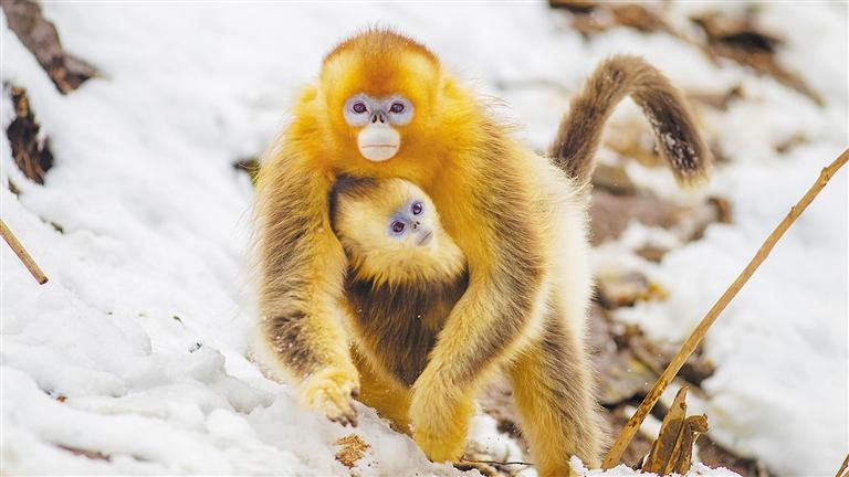 2月24日,四川省綿陽(yáng)市平武縣黃羊關(guān),川金絲猴母子下山覓食。今年4月22日是第57個(gè)世界地球日,活動(dòng)主題為“珍愛(ài)自然資源 守護(hù)美麗中國(guó)”。田明章攝(中經(jīng)視覺(jué))