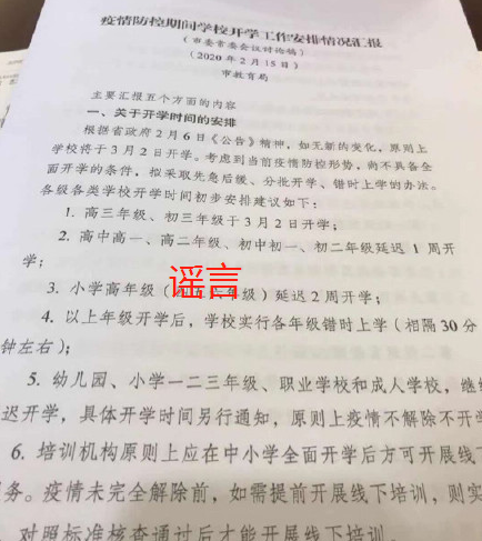 經(jīng)濟(jì)日?qǐng)?bào)-中國(guó)經(jīng)濟(jì)網(wǎng)2月19日訊 (記者朱國(guó)旺郭文培) 近日,一張名為“疫情防控期間學(xué)校開(kāi)學(xué)工作安排情況匯報(bào)”的截圖在網(wǎng)上瘋傳。截圖顯示,這是一份學(xué)校開(kāi)學(xué)安排情況的討論稿,對(duì)開(kāi)學(xué)時(shí)間作了初步安排,并有如下表述:“根據(jù)省政府2月6日《公告》精神,如無(wú)新的變化,原則上學(xué)校將于3月2日開(kāi)學(xué)?!?/span>