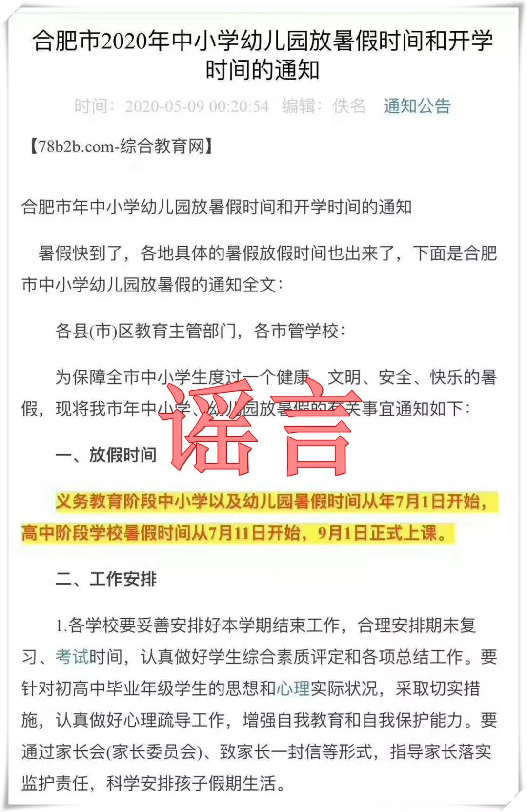 據(jù)合肥市教育局官微,5月9日,一則題為“合肥市2020年中小學幼兒園放暑假時間和開學時間的通知”的消息在網(wǎng)絡上傳播,消息顯示“義務教育階段中小學以及幼兒園暑假時間從7月1日開始,高中階段學校暑假時間從7月11日開始,9月1日正式上課。”經(jīng)核實,合肥市教育局此前未發(fā)布過相關(guān)公告,該則消息為謠言。