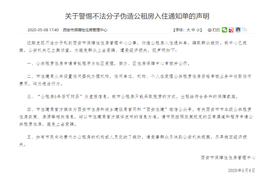 此外,西安市保障性住房管理中心提醒,近期發(fā)現(xiàn)不法分子私刻西安市保障性住房管理中心公章,偽造公租房入住通知單,騙取群眾錢財。目前,西安市保障性住房管理中心中心已報案,公安機(jī)關(guān)已立案偵查。