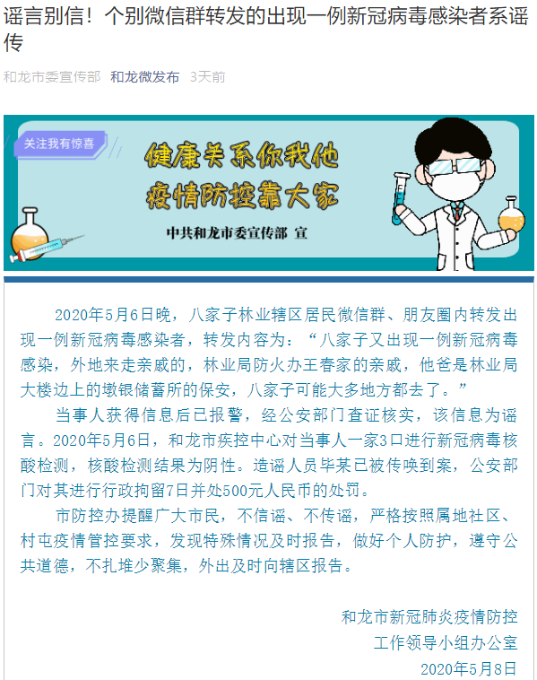 據(jù)和龍市委宣傳部官微5月8日消息,5月6日,和龍市疾控中心對當(dāng)事人一家3口進(jìn)行新冠病毒核酸檢測,核酸檢測結(jié)果為陰性。目前,造謠人員畢某已被傳喚到案,公安部門對其進(jìn)行行政拘留7日并處500元人民幣的處罰。