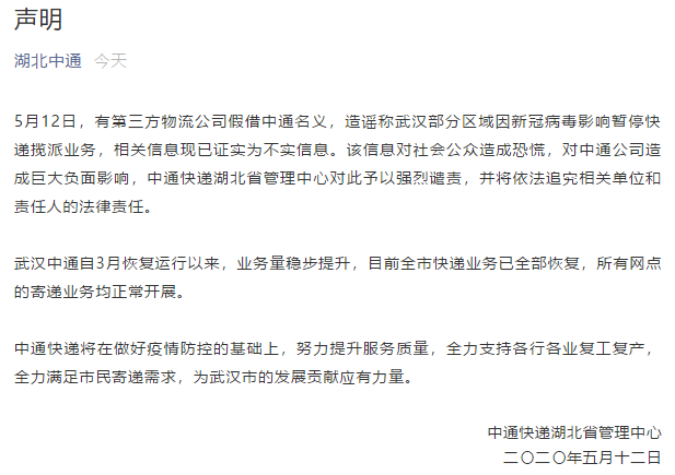 中通快遞湖北省管理中心表示,該信息對社會公眾造成恐慌,對中通公司造成巨大負(fù)面影響,中通快遞湖北省管理中心對此予以強(qiáng)烈譴責(zé),并將依法追究相關(guān)單位和責(zé)任人的法律責(zé)任。