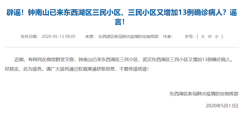 經(jīng)濟(jì)日報-中國經(jīng)濟(jì)網(wǎng)5月13日訊(記者朱國旺 郭文培)據(jù)武漢市東西湖區(qū)人民政府官網(wǎng)5月13日消息,近期,有網(wǎng)民在微信群發(fā)文稱,鐘南山已來東西湖區(qū)三民小區(qū),武漢東西湖區(qū)三民小區(qū)又增加13例確診病人。經(jīng)核實,此為謠言。請廣大居民通過權(quán)威渠道獲取信息,不要傳謠信謠。