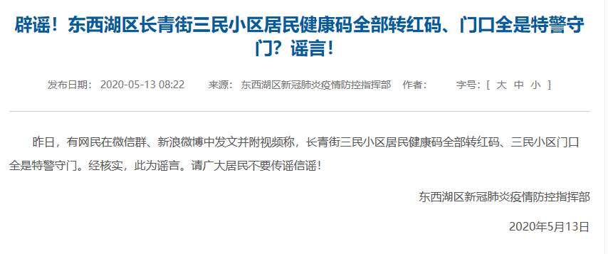 此外,東西湖區(qū)新冠肺炎疫情防控指揮部表示,經(jīng)核實,“長青街三民小區(qū)居民健康碼全部轉(zhuǎn)紅碼、三民小區(qū)門口全是特警守門”也系謠言。