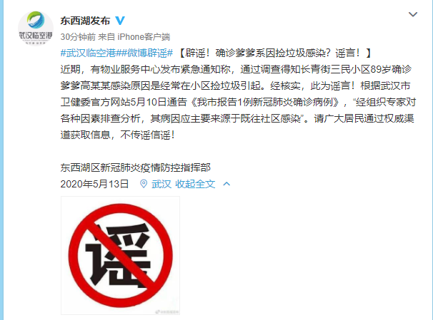 據(jù)武漢市東西湖區(qū)人民政府官方微博5月13日消息,近期,有物業(yè)服務(wù)中心發(fā)布緊急通知稱,通過(guò)調(diào)查得知武漢市東西湖區(qū)長(zhǎng)青街三民小區(qū)89歲確診爹爹高某某感染原因是經(jīng)常在小區(qū)撿垃圾引起。經(jīng)核實(shí),此為謠言。根據(jù)武漢市衛(wèi)健委官方網(wǎng)站5月10日通告《我市報(bào)告1例新冠肺炎確診病例》,“經(jīng)組織專家對(duì)各種因素排查分析,其病因應(yīng)主要來(lái)源于既往社區(qū)感染”。請(qǐng)廣大居民通過(guò)權(quán)威渠道獲取信息,不傳謠信謠!