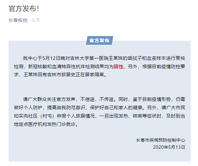近日,有網(wǎng)傳稱吉林大學(xué)第一醫(yī)院出現(xiàn)新冠病例。5月13日,長(zhǎng)春市疾病預(yù)防控制中心官微對(duì)此回應(yīng)稱,長(zhǎng)春市疾病預(yù)防控制中心于5月12日晚對(duì)吉林大學(xué)第一醫(yī)院王某姝的咽拭子和血液樣本進(jìn)行復(fù)核檢測(cè),新冠核酸和血清特異性抗體檢測(cè)結(jié)果均為陰性。另外,根據(jù)目前疫情防控要求,王某姝因有吉林市旅居史正在居家隔離。請(qǐng)廣大群眾關(guān)注官方發(fā)聲,不信謠,不傳謠。