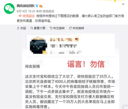 6月14日18時(shí)許,@支付寶對(duì)此回應(yīng)稱(chēng),支付寶沒(méi)有提供過(guò)下圖所說(shuō)的數(shù)據(jù),疫情相關(guān)信息請(qǐng)以衛(wèi)生防疫部門(mén)官方發(fā)布為準(zhǔn)。隨后,@騰訊微信團(tuán)隊(duì) 也發(fā)布辟謠消息稱(chēng),微信并未提供過(guò)下圖提的數(shù)據(jù),請(qǐng)大家認(rèn)準(zhǔn)衛(wèi)生防疫部門(mén)官方信息發(fā)布渠道,勿信謠傳謠。
