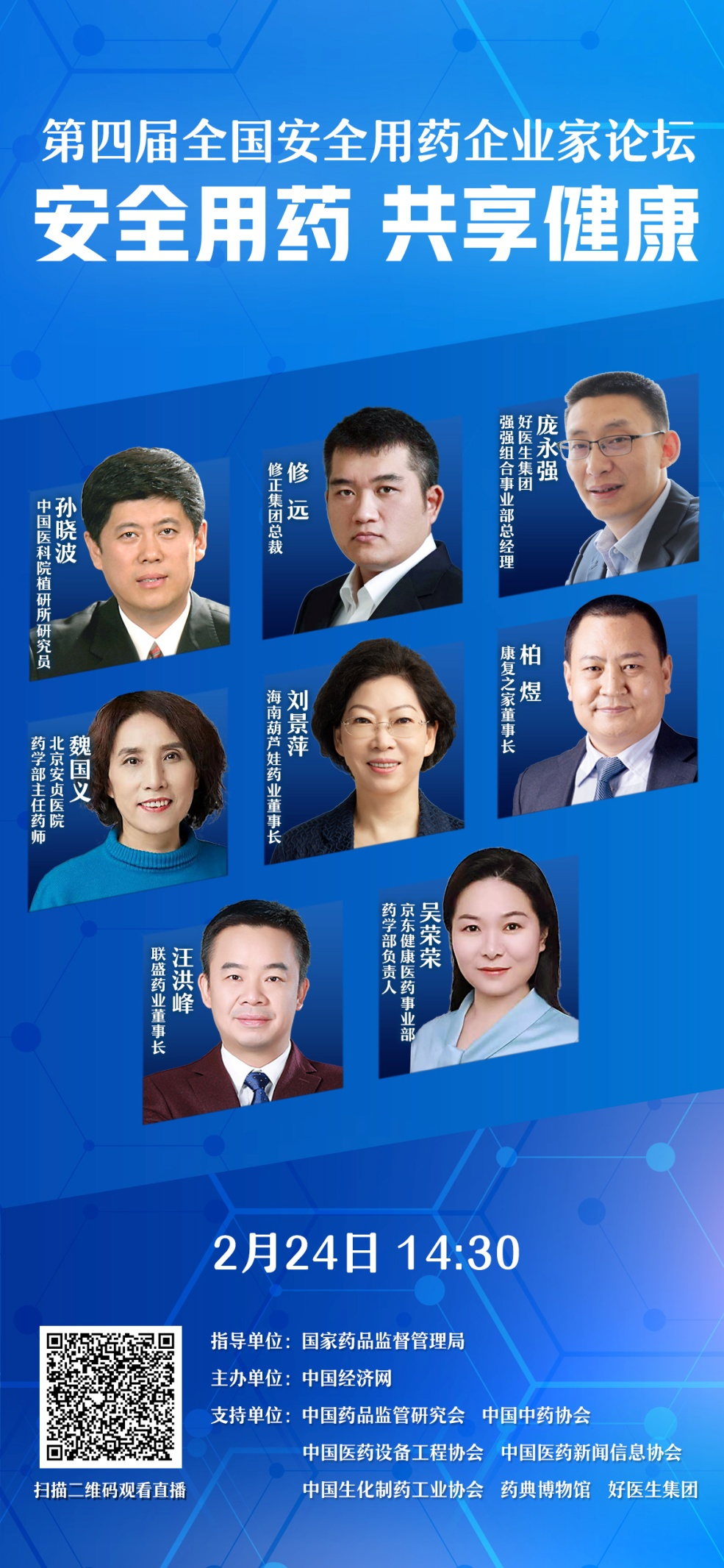 2月24日,由國家藥品監(jiān)督管理局指導,中國經(jīng)濟網(wǎng)主辦的“第四屆全國安全用藥企業(yè)家論壇”在北京召開。此次論壇是“全國安全用藥月”系列活動的組成部分,論壇主題為“安全用藥 共享健康”。國家藥品監(jiān)管部門領導與知名醫(yī)藥專家、企業(yè)家,還有來自全國的企業(yè)代表、基層醫(yī)生藥師齊聚一堂,從安全發(fā)展到協(xié)同共治的視角,對安全用藥及醫(yī)藥產(chǎn)業(yè)高質(zhì)量發(fā)展展開深入交流。論壇通過中國經(jīng)濟網(wǎng)新媒體、中經(jīng)云端、百度直播、抖音、快手等直播平臺同時對外直播,總關注人數(shù)逾百萬。